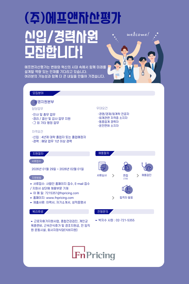 에프앤자산평가 경영지원본부 인사 및 총무 채용(~02/01)